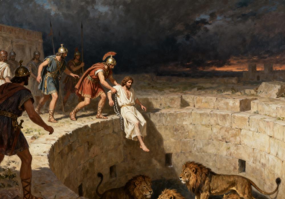 “大流士随心所愿,立一百二十个总督,治理通国。又在他们以上立总长三人(但以理在其中),使总督在他们三人面前回复事务,免得王受亏损。因这但以理有美好的灵性,所以显然超乎其余的总长和总督,王又想立他治理通国。那时总长和总督寻找但以理误国的把柄,为要参他;只是找不着他的错误过失,因他忠心办事,毫无错误过失。那些人便说:‘我们要找参这但以理的把柄,除非在他神的律法中就寻不着。’于是,总长和总督纷纷聚集来见王说:‘愿大流士王万岁!国中的总长、钦差、总督、谋士和巡抚彼此商议,要立一条坚定的禁令(或作“求王下旨要立一条云云”),三十日内不拘何人,若在王以外,或向神、或向人求什么,就必扔在狮子坑中。王啊,现在求你立这禁令,加盖玉玺,使禁令决不更改,照玛代和波斯人的例,是不可更改的。’于是大流士王立这禁令,加盖玉玺。但以理知道这禁令盖了玉玺,就到自己家里(他楼上的窗户开向耶路撒冷),一日三次双膝跪在他神面前,祷告感谢,与素常一样。” (《但以理书》6:1―5)“王下令,人就把但以理带来,扔在狮子坑中。王对但以理说:‘你所常侍奉的神,他必救你。’”(《但以理书》6:16)“‘我的神差遣使者封住狮子的口,叫狮子不伤我,因我在神面前无辜,我在王面前也没有行过亏损的事。’王就甚喜乐,吩咐人将但以理从坑里系上来。于是但以理从坑里被系上来,身上毫无伤损,因为信靠他的神。”(《但以理书》6:22―23)因大流士王把但以理立为宰相(三个总长之一)管理120个总督,这些总督们联合起来想要陷害他,于是设计将他扔进狮子坑里,他在狮子坑里祷告求神帮助,神差遣使者封住狮子的口,叫狮子不伤他,因为他在神面前无过,在王面前没行过亏损的事。最后,因为此事大流士王信主,说:“……他是永远长存的活神,他的国永不败坏;他的权柄永存无极!他护庇人,搭救人,在天上地下施行神迹奇事,救了但以理脱离狮子的口。”(《但以理书》 6:26—27)。