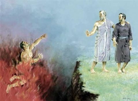 《路加福音》16章23至31节:“他在阴间受痛苦,举目远远地望见亚伯拉罕,又望见拉撒路在他怀里,就喊着说:‘我祖亚伯拉罕哪,可怜我吧!打发拉撒路来,用指头尖蘸点水,凉凉我的舌头,因为我在这火焰里,极其痛苦路。’亚伯拉罕说:‘儿啊,你该回想你生前享过福,拉撒路也受过苦,如今他在这里得安慰,你倒受痛苦。不但这样,并且在你我之间,有深渊限定,以致人要从这边过到你们那边是不能的;要从那边过到我们这边也是不能的。’财主说:‘我祖啊,即是这样,求你打发拉撒路到我父家去,因为我还有五个弟兄,他可以对他们作见证,免得他们也来到这痛苦的地方。’亚伯拉罕说:‘他们有摩西和先知的话可以听从。’他说:‘我祖亚伯拉罕哪,不是的,若有一个从死里复活的,到他们那里去的,他们必要悔改。’”亚伯拉罕说:‘若不听从摩西和先知的话,就是有一个从死里复活的,他们也是不听劝。’”