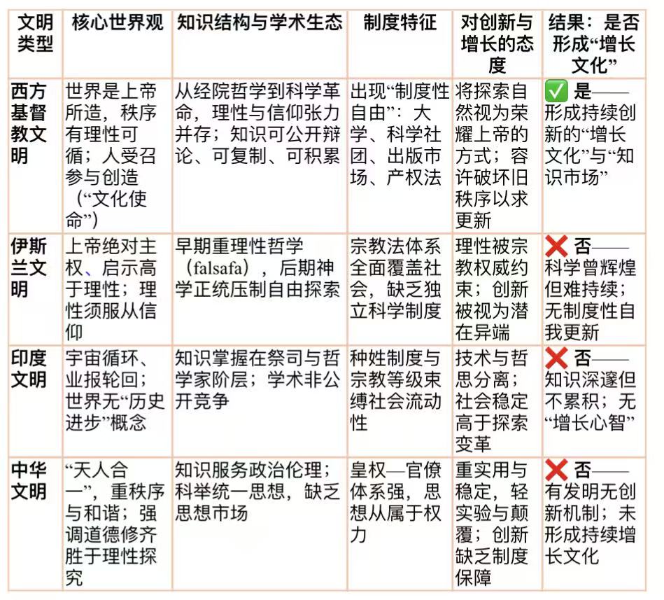 一句总结:西方文明的独特之处,不在于智力的优越,而在于信仰与理性之间达成了一种“张力性的和解”。这种和解,使得知识成为一种公共使命,也使“增长”成为一种文明心智,而非单纯的经济现象。
