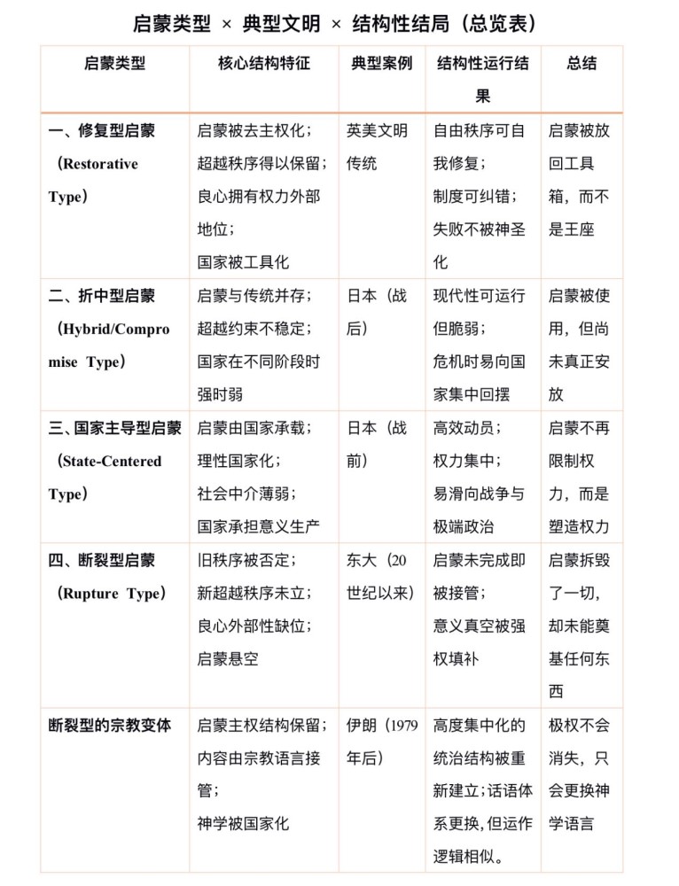 综合上述阐述,列出下表,并非国家评价,而是启蒙类型学在现实文明中的结构性验证。国家在此仅作为“理想型显影液”,用以检验不同文明条件下,启蒙逻辑将被推向何种结局。