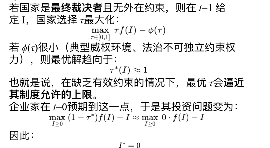 没有神圣边界:τ 由主权者事后重置 → 企业家事前不投资 → 产权与增长一起坍塌。