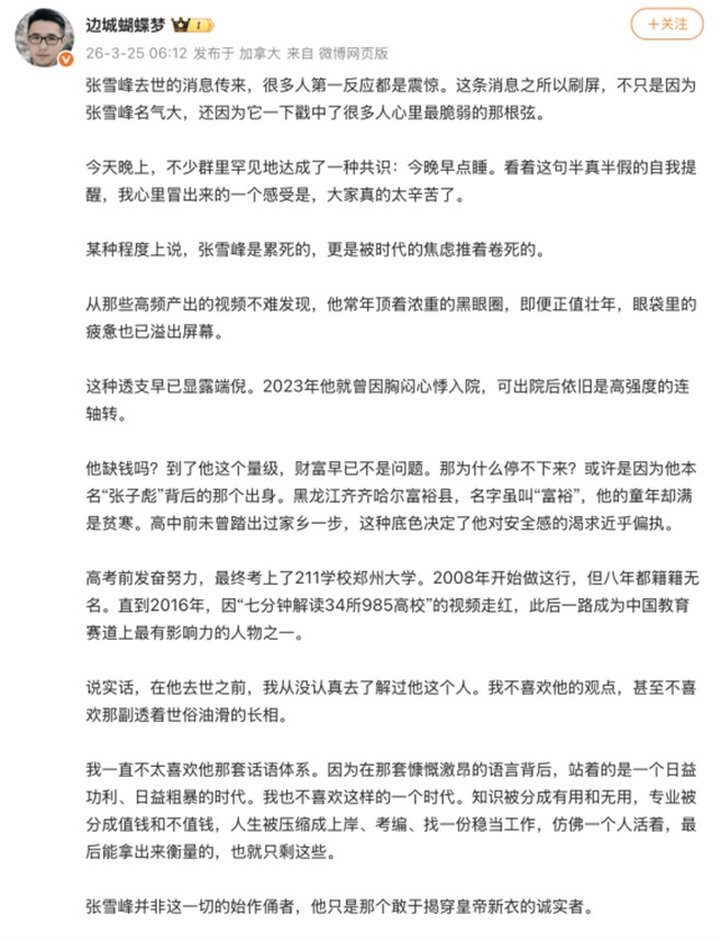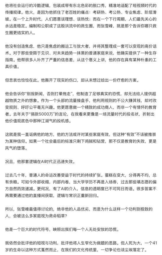 最近,一篇悼念张雪峰的文章在网上广泛传播(边城蝴蝶梦,2026)。